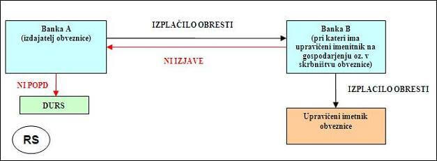 3. Slovenska banka A je izdajateljica obveznice. Ob zapadlosti kupona slovenska banka A izplača obresti banki B v Sloveniji, pri kateri imajo fizične osebe obravnavane obveznice na gospodarjenju, pravne osebe pa v skrbništvu.